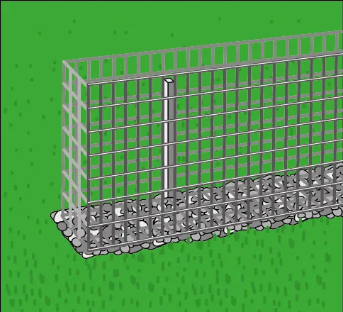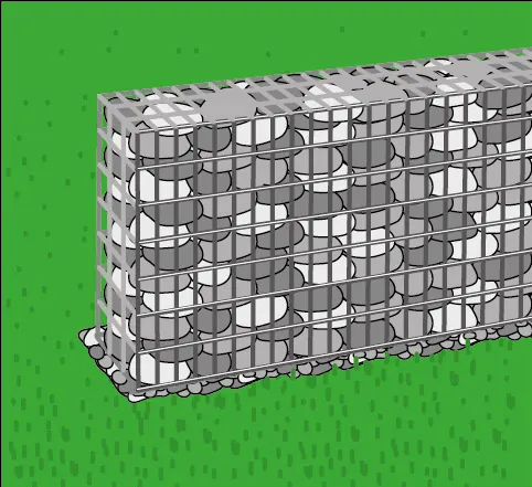 Wenn das verwendete Gabionensystem kein Bodengitter vorsieht, müssen bereits an der untersten Drahtreihe Distanzhalter angebracht werden. Du kannst auch die Seitenwände (Matten) an mehreren Stellen mit rostfreiem Draht an den Pfosten in der Mitte verbinden und dadurch zusätzlich sichern.