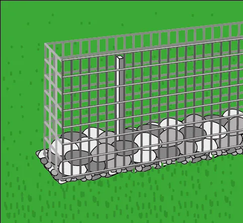 Danach werden zusätzliche Fundamentlöcher im Abstand von maximal 150 cm (Lochmitte zu Lochmitte) 80 cm tief ausgehoben und unten mit einer ca. 10-20 cm dicken Kiesschicht gefüllt. In die Fundamentlöcher werden die Pfosten eingestellt. Die Pfostenlängen sollten so geplant werden, dass diese nachher ca. 10 cm unter der Oberkante der Gabione enden. Die Pfosten seitlich mit Latten abstützen und die Pfostenlöcher mit Beton füllen. Hier kannst du einen Trockenbeton verwenden.