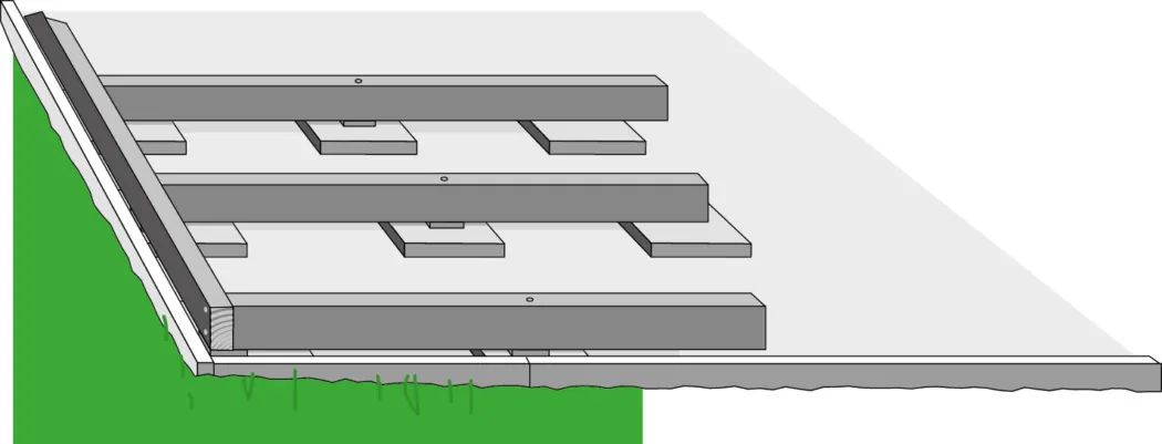 Als Lager für die Terrassenunterkonstruktion werden Terrassenplatten oder Gehwegplatten von 30 x 30 cm gleichmäßig verlegt. Die äußeren Platten werden unmittelbar an den Randsteinen angeordnet. Die mittleren Platten mit gleichen Abständen verteilen. Der lichte Abstand zwischen den Platten sollte in etwa 30 cm betragen.