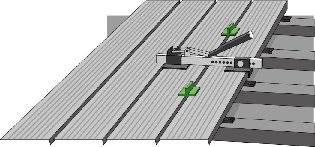 Da u.U. nicht jede Terrassendiele so gerade ist wie sie sein sollte, kannst du diese zum Verschrauben verspannen. So kannst du dich reihenweise vorarbeiten.
