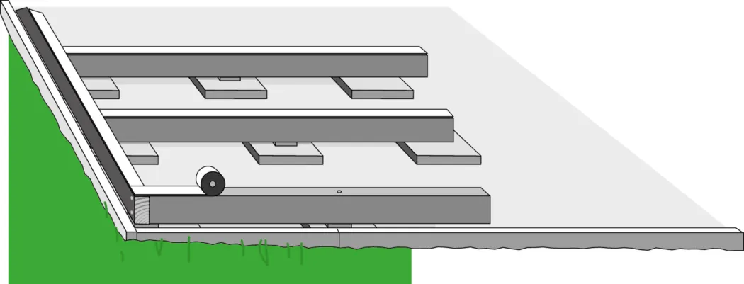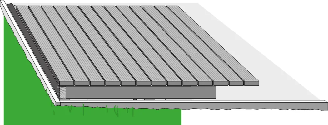 Die Unterkonstruktion verläuft in diesem Beispiel parallel zum Haus. So verlaufen die Terrassendielen mit dem Gefälle vom Haus weg. Verwende für die Unterkonstruktion das gleiche Material wie die Terrassendielen. An jedem Auflagepunkt wird eine Terrassenunterlage untergelegt. Diese sorgen für den Schutz des Holzes vor Nässe.