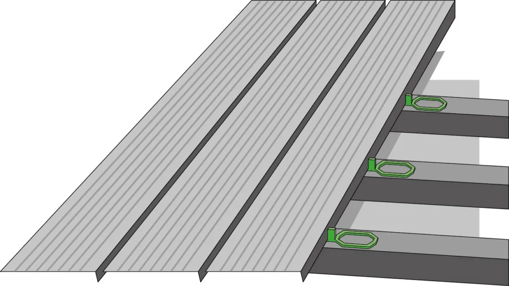 Mit speziellen Distanzhaltern ist eine Hinterlüftung der Terrassendielen und ein gleichmäßiger Fugenabstand gegeben.