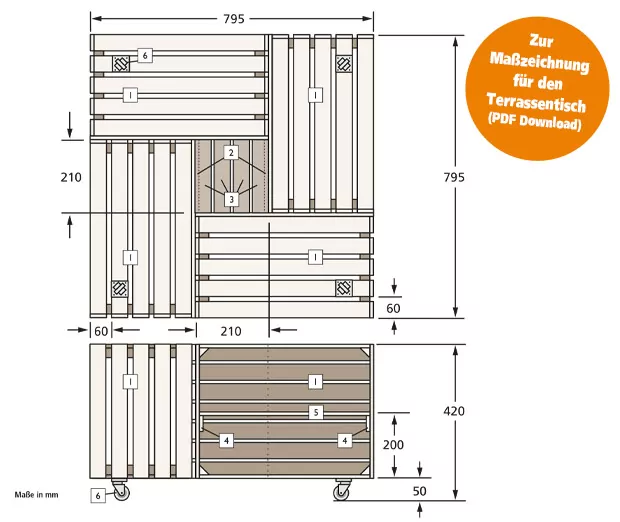 In den Kisten können noch Zwischenböden ergänzt werden. Markiere an einer Latte die benötigte Tiefe. Die Böden werden außerhalb der Kisten montiert. Dann kannst du sie einsetzen und anschrauben. Drehe den Tisch um, damit auf der Unterseite Rollen angebracht werden können. Setze diese etwas weiter nach innen, so sind sie nachher nicht sichtbar. Drehe den fertig montierten Terrassentisch nun wieder um. Abschließend kannst du ihn grundieren und mit einer passenden Lasur farblich gestalten.