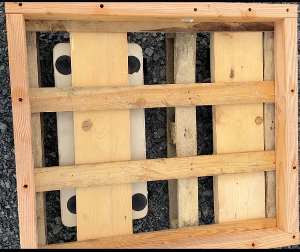 Als Basis kannst du beispielsweise eine Europalette verwenden, die du bei Bedarf auf die gewünschte Länge kürzt. Darauf wird ein stabiler Rahmen aus Konstruktionsholz verschraubt, der dem Kübel die nötige Struktur gibt.