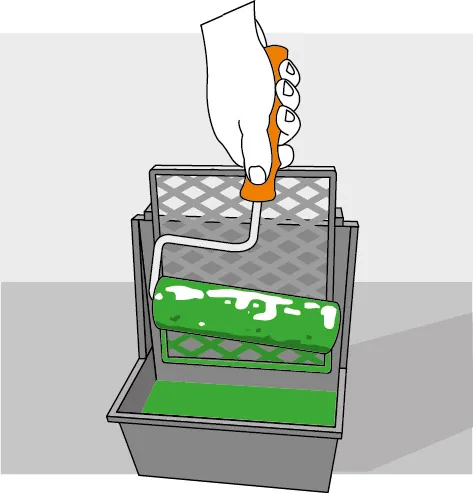 Bereite die Streichwerkzeuge vor. Man arbeitet am besten mit einer Farbwanne, einem Abstreifgitter und einer hochwertigen Farbwalze. Das Aufnehmen der Farbe direkt aus dem Eimer sollte vermieden werden. Halte den Rand oben am Farbeimer sauber, dann lässt er sich später besser verschließen.