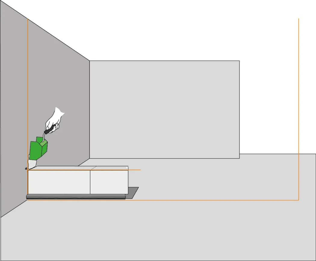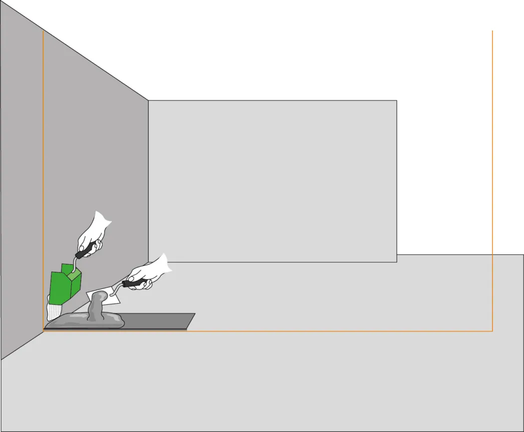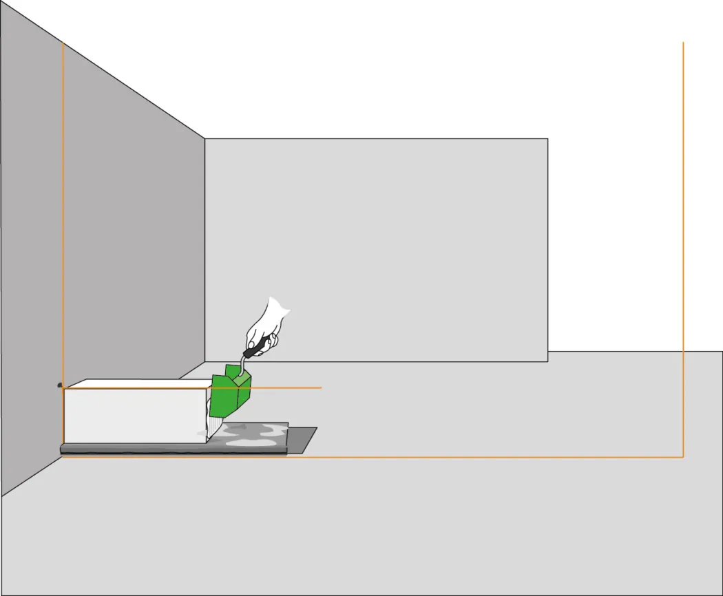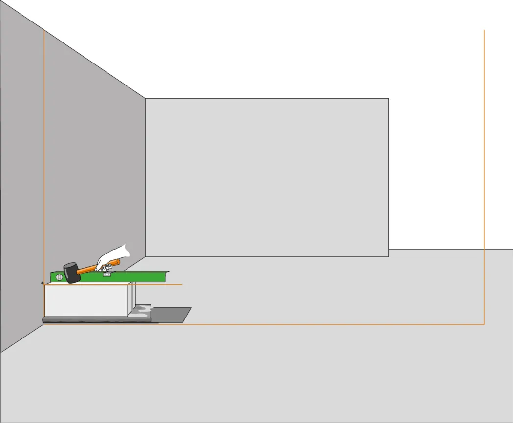 Jetzt kannst du den ersten Stein setzen. Mit dem Gummihammer wird er ins Mörtelbett geklopft und mit der Wasserwaage ausgerichtet. Spanne eine Maurerschnur bis zur gegenüberliegenden Wandseite und richte sie mit der Wasserwaage aus.