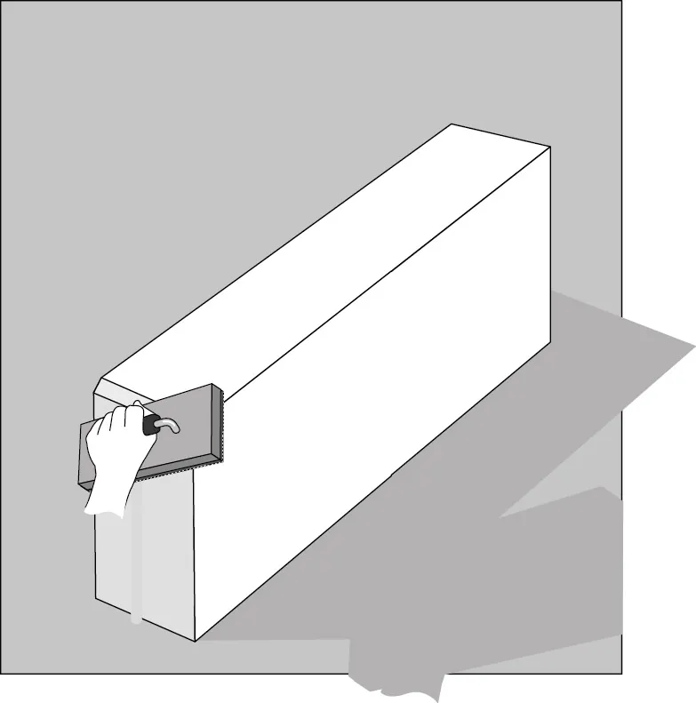 Die Steine ab der zweiten Reihe werden jetzt nur noch mit dem Dünnbettmörtel geklebt. Trage den Dünnbettmörtel mit der Kleberkelle auf die angrenzende Wandfläche und auf die Lagerfuge der unteren Steine auf.