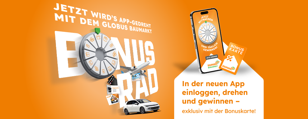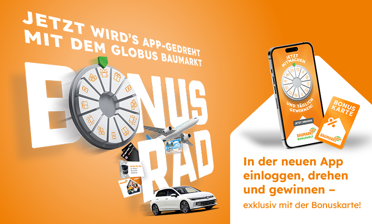 Das Bonusrad findet im Zeitraum vom 30.10.2025 bis 30.11.2025 ausschließlich in der Globus Baumarkt App statt und steht nur Kunden mit einer Globus Baumarkt Kundenkarte zur Verfügung.