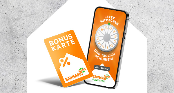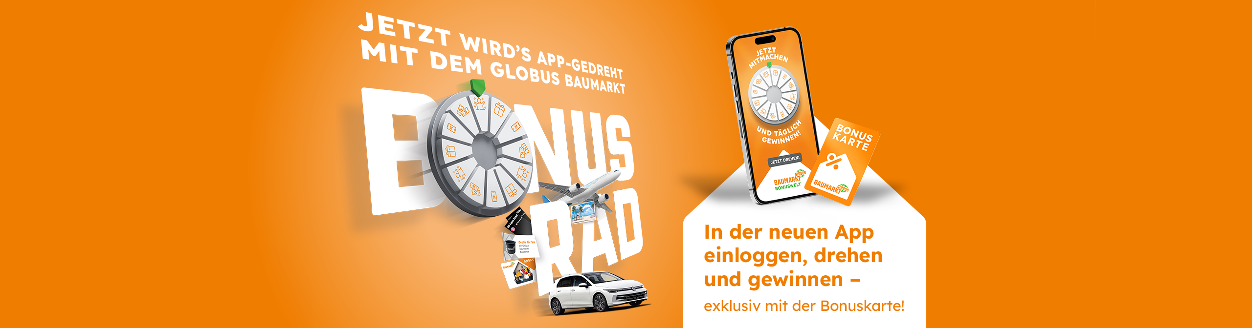 Das Bonusrad findet im Zeitraum vom 30.10.2025 bis 30.11.2025 ausschließlich in der Globus Baumarkt App statt und steht nur Kunden mit einer Globus Baumarkt Kundenkarte zur Verfügung.