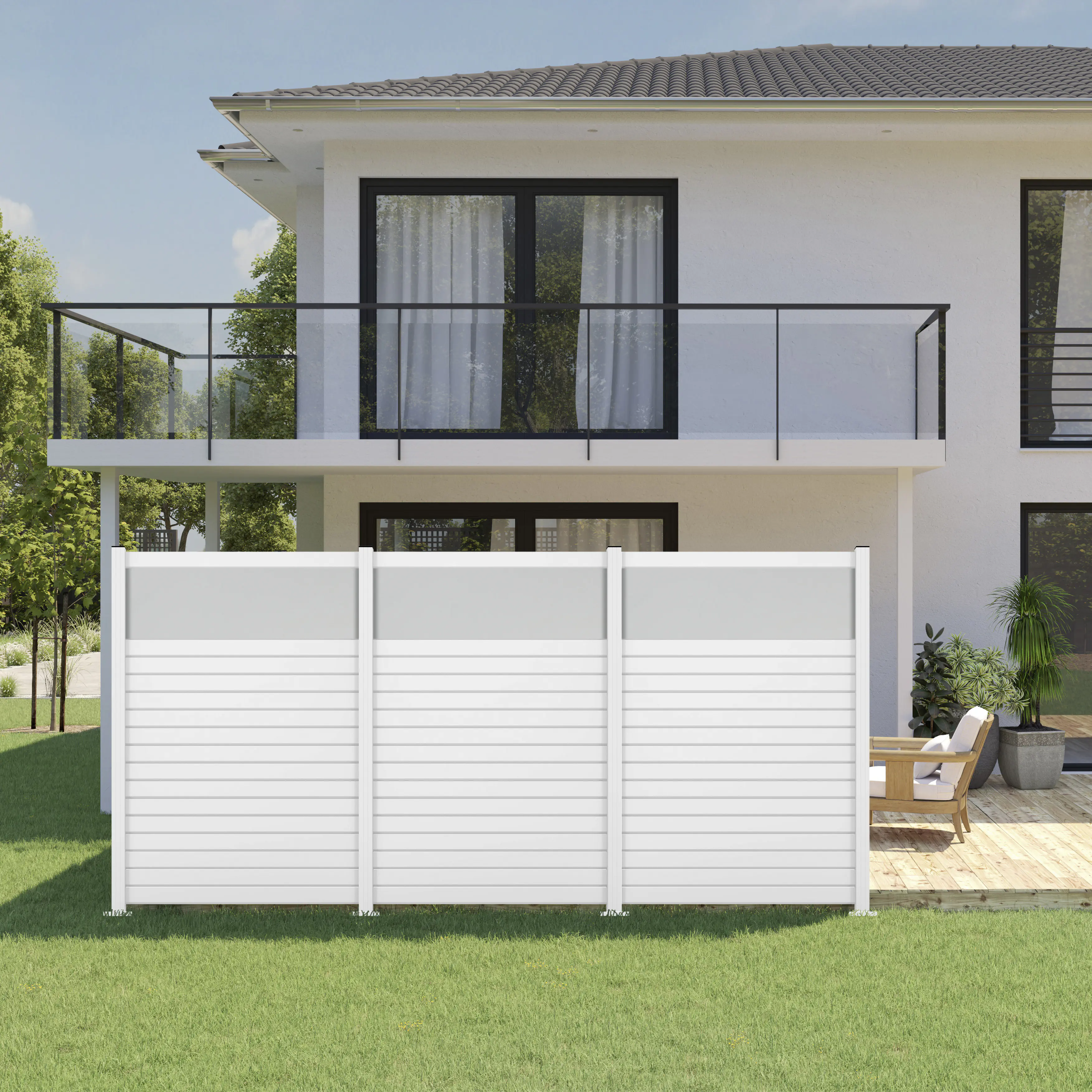 Der Ambiente Starterzaun eignet sich perfekt als Wind- und Sichtschutz. Die Rhombuspaneele werden abwechselnd mit Abstandsstegen in die Pfosten eingesetzt. Die oberen und unteren Stege werden in den Pfosten verschraubt, alle anderen Systemteile werden einfach in die Ausbuchtungen der Pfosten geschoben. Die ebenfalls im Alles-Drin-Paket enthaltenen Pfosten können einbetoniert oder aufgeschraubt werden. Dank der kratzfesten Pulverbeschichtung ist dieses System besonders pflegeleicht. Dieses Paket enthält neben den Rhombuspaneelen und Pfosten einen vollflächig satinierten Glasstreifen. Mit den Ambiente Anbauzäunen kann der Zaun unendlich erweitert werden. Auch Lösungen über Eck sind dank der drei Öffnungen im Pfosten möglich. Nicht genutzte Öffnungen werden mit den mitgelieferten Abdeckblenden verschlossen.