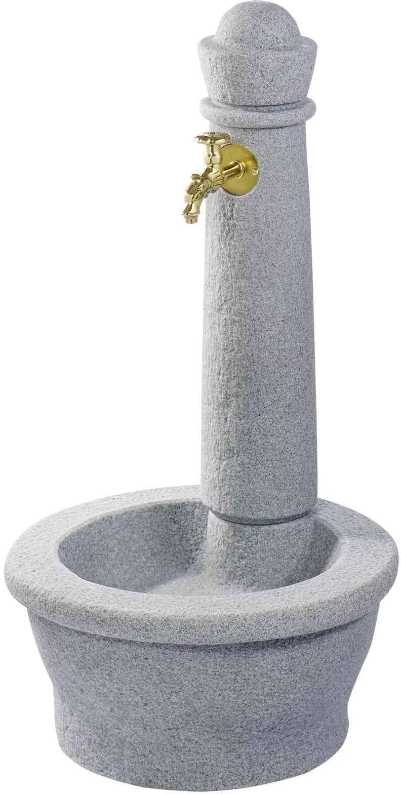 Der Garantia Steinbrunnen Roma lässt sich optimal in jedem Garten oder auf der Terrasse integrieren. Dank dem einzigartigen Design sowie der detailgetreuen Oberflächengestaltung ist jeder Brunnen ein Unikat. Im Gegensatz zu natürlichen Steinbrunnen, weiß die attraktive Wasserquelle durch ein geringes Gewicht zu überzeugen und bietet Ihnen somit ein komfortables Handling. Der Garantia Brunnen Roma verfügt über ein hohes Brunnenbecken sowie eine bequeme Wasserentnahme mit dem vormontierten Nostalgie-Auslaufhahn. Eine Anschlussmöglichkeit von unten besteht über einen Schlauchanschluss. Bei der Installation des Brunnens haben Sie die Möglichkeit durch Bohrungen eine einfache Befestigung am Aufstellort zu realisieren.