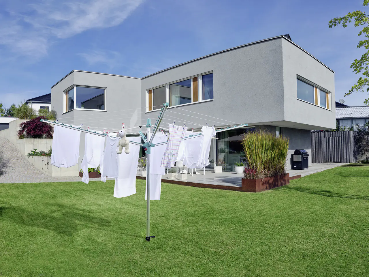 Produktnummer: 0655501198Die Linomatic 500 Easy bietet die millionenfach bewährte Leifheit Leinenautomatik in leichtem, offenem Design. Wie bei allen Linomatic Wäscheschirmen liegen die Leinen im geschlossenen Zustand schmutzgeschützt in den Tragarmen. Saubere Leinen - saubere Wäsche! Für leichtes Öffnen sorgt das Easy-Lift-System. Einfach an der Aufzugsleine ziehen und schon spannen sich die Leinen auf. Beim Schließen der Wäschespinne werden sie automatisch wieder eingezogen. Auf Grund kleiner Rasteinheiten bleiben die Leinen auch nach jahrelangem Gebrauch noch straff gespannt. Mit 50 m Leinenlänge bietet die Linomatic 500 Easy Platz für bis zu fünf Waschmaschinenfüllungen - auch große Wäschestücke wie Betttücher, Tischdecken und Badehandtücher. Alle eingesetzten Materialien sind witterungs- und UV-beständig. Inklusive Bodenhülse zum Einbetonieren. Made in Germany.