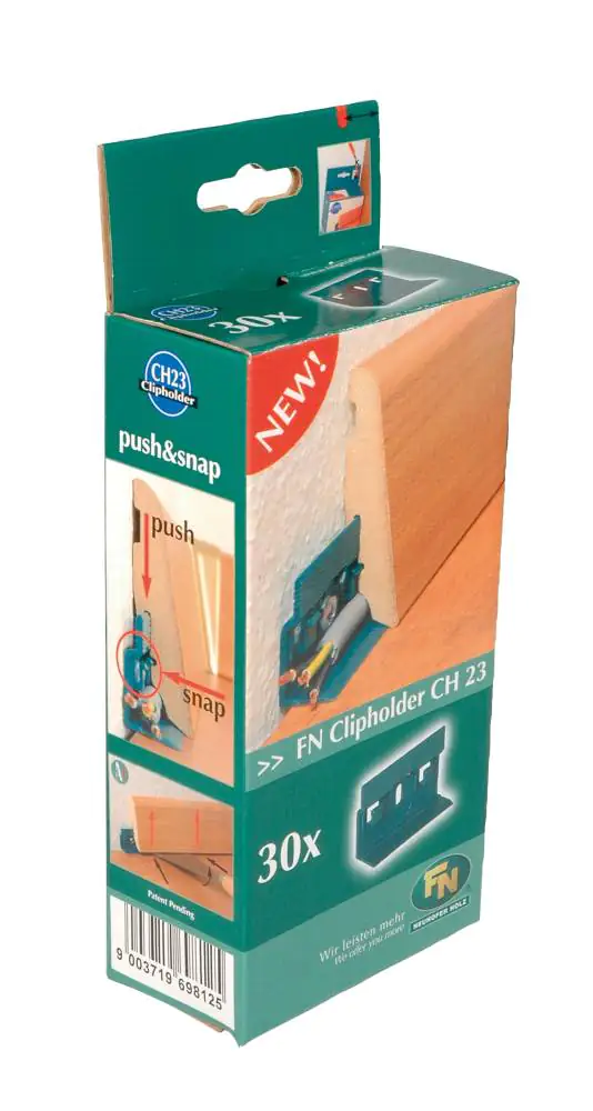 Schnell und praktisch - so lässt sich der FN Clipholder CH23 wohl am besten beschrieben. Dadurch wird eine schnelle, saubere wie auch unsichtbare Montage der Leisten ermöglicht. Zudem passt sich der Clip an unregelmäßiges Mauerwerk an, indem er geklebt, geschraubt oder mittels Nagelschussapparat an die Wand angebracht wird.
