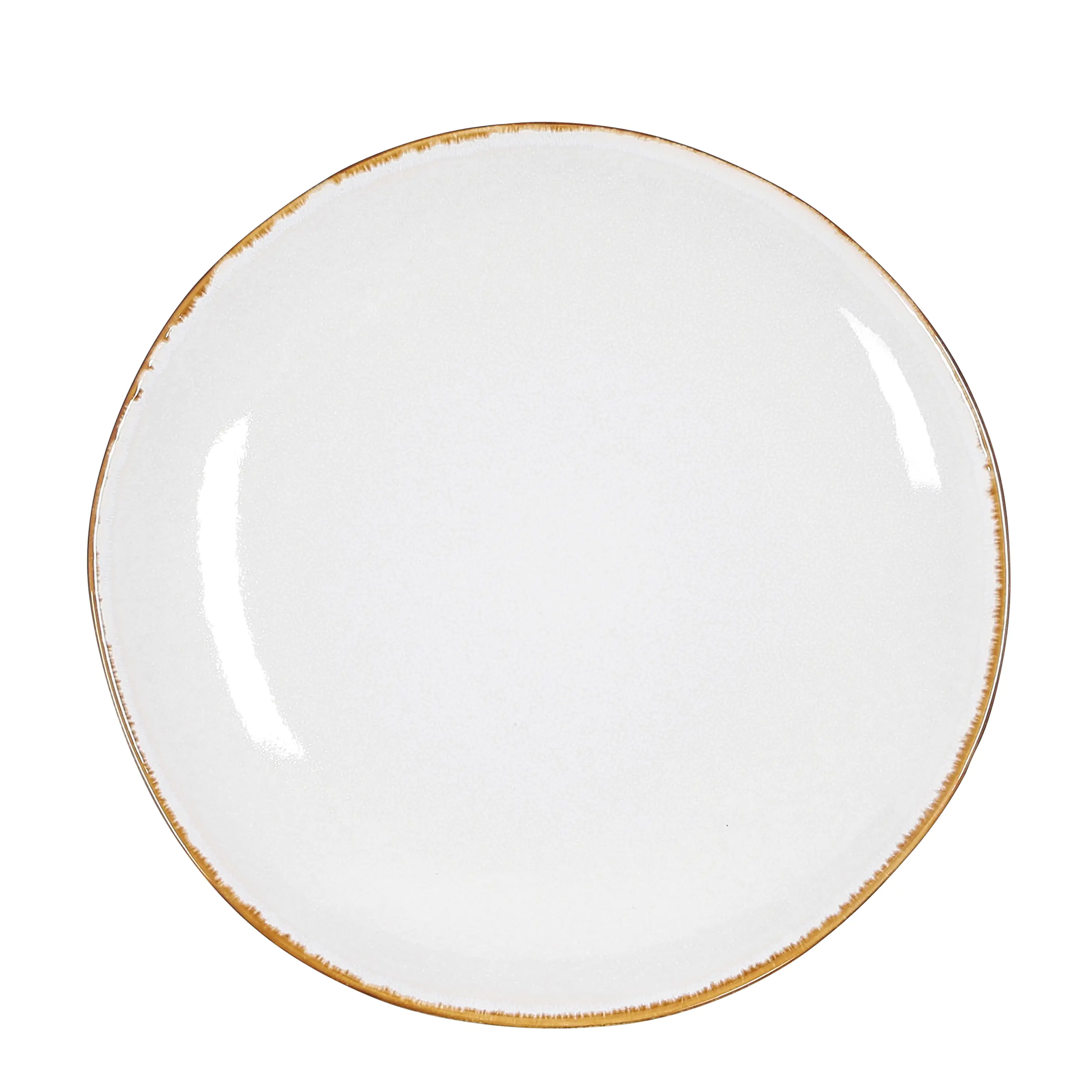 Rustikal und robust - mit diesen Begriffen lässt sich das Tabo-Service von Mica Decorations am besten beschreiben. Es ist handgefertigt und in neutralen, wohnlichen Farbnuancen ausgeführt und bildet damit einen angenehmen Kontrast zu herkömmlichen weißen Produkten mit langweiliger, perfekter Linienführung. Jedes Produkt zeichnet sich durch einen individuellen, authentischen Look aus, der zu einem unkomplizierten Lebensgefühl im Alltag passt. Dieser Keramikteller mit einem Durchmesser von 26,5 cm ist weiß, hat aber einen braunen Rand, der ihm einen kunstvollen Look verleiht. Eine stilvolle Ergänzung für jedes Interieur! Der Speiseteller ist bis zu einer Temperatur von 180 °C hitzebeständig und außerdem spülmaschinen- und mikrowellengeeignet.