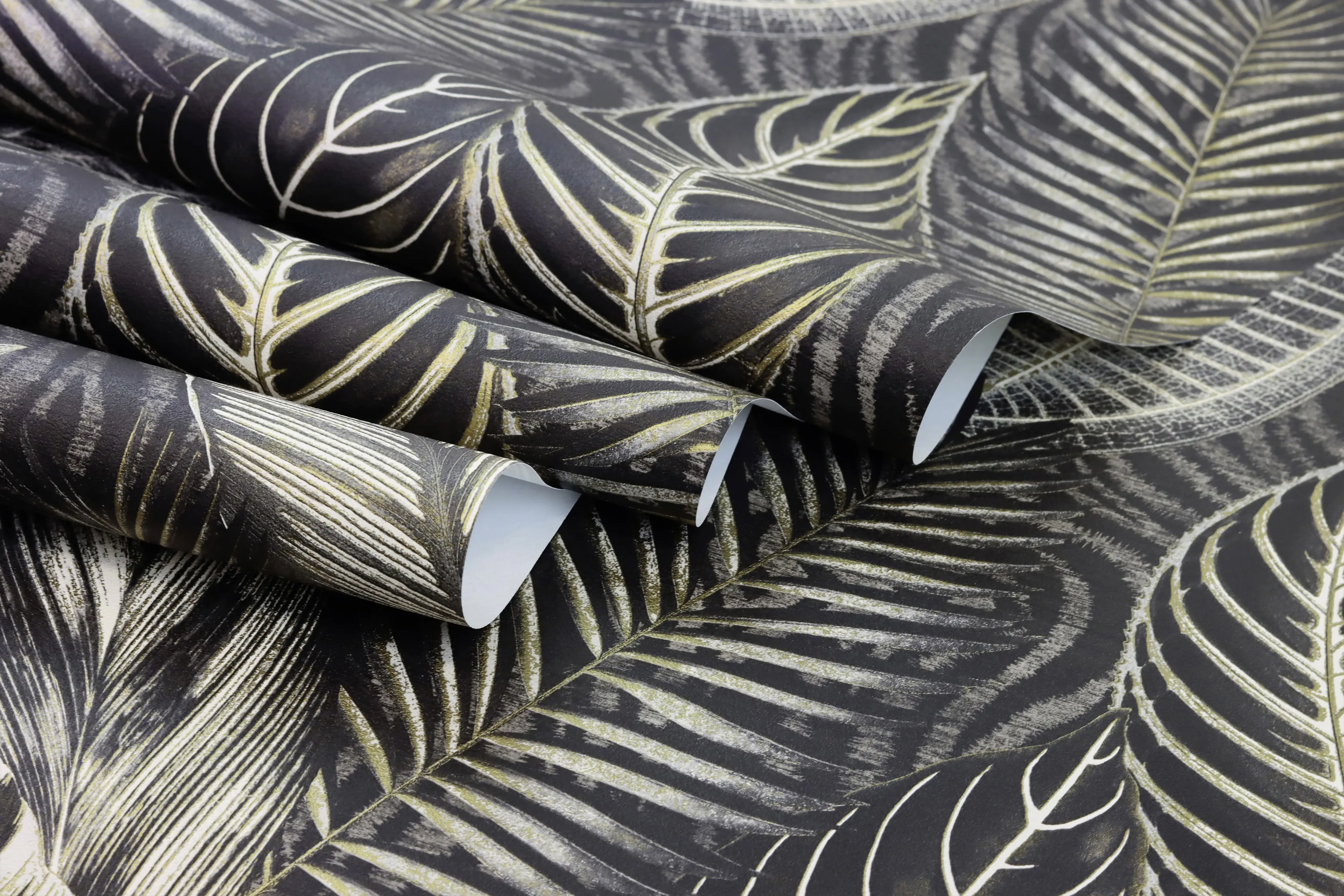 Exotische Blattmotive dürfen ab sofort auch an den Wänden wuchern. Denn hier präsentieren sich die unterschiedlichsten Blätter in Übergröße in Schwarz und Weiß und werden mit Highlights in glänzendem Gold zum absoluten Blickfang. Aber was ist das? Ein Meister der Tarnung versteckt sich im Dickicht. Wenn man genau hinschaut, sieht man das Fell eines Zebras in Grau und Schwarz durch die Pflanzen scheinen.