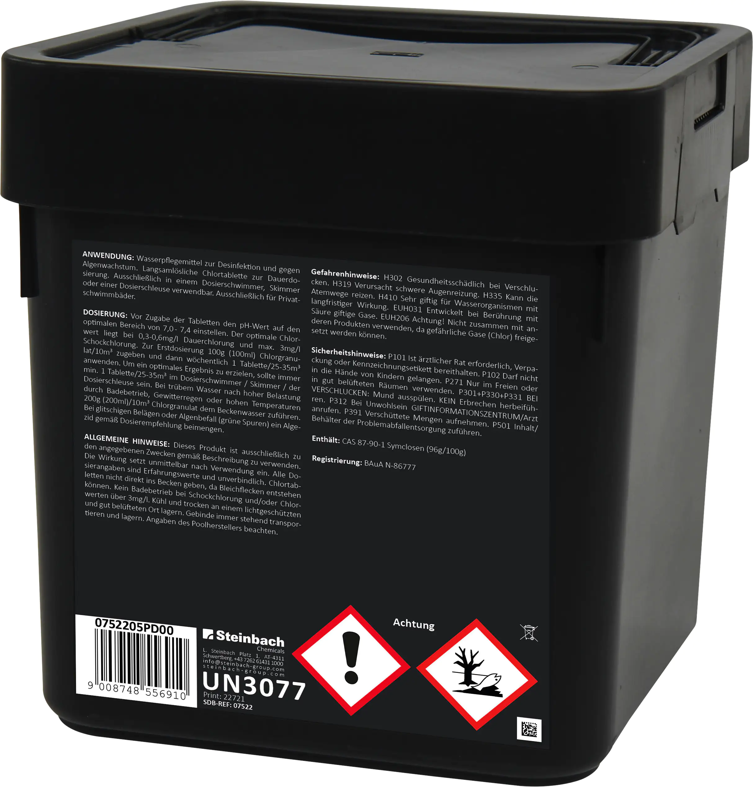 Langsam lösliche Chlortabletten zur Schwimmbaddesinfektion Chlortabs 200 g langsam löslich, 5,00 kg, UN3077, Acute Tox. 4, Eye Irrit. 2, STOT SE 3, Aquatic Acute 1, Aquatic Chronic 1 ANWENDUNG: Wasserpflegemittel zur Desinfektion und gegen Algenwachstum. Langsamlösliche Chlortablette zur Dauerdosierung. Ausschließlich für Privatschwimmbäder. Ausschließlich in einem Dosierschwimmer oder einer Dosierschleuse verwendbar. DOSIERUNG: Vor Zugabe der Tabletten den pH-Wert auf den optimalen Bereich von 7,0 - 7,4 einstellen. Der optimale Chlorwert liegt bei 0,3-0,6mg/l Dauerchlorung und max. 3mg/l Schockchlorung. Zur Erstdosierung 100g (100ml) Chlorgranulat/10m³ zugeben und dann wöchentlich 1 Tablette/25-35m³ anwenden. Um ein optimales Ergebnis zu erzielen, sollte immer min. 1 Tablette/25-35m³ im Dosierschwimmer / der Dosierschleuse sein. Bei trübem Wasser nach hoher Belastung durch Badebetrieb, Gewitterregen oder hohen Temperaturen 200g (200ml)/10m³ Chlorgranulat dem Beckenwasser zuführen. Bei glitschigen Belägen oder Algenbefall (grüne Spuren) ein Algezid gemäß Dosierempfehlung beimengen.